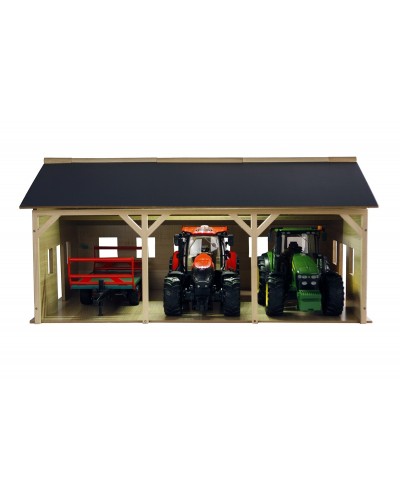 Big Wooden Farm Shed in scale 1:32, can shelter up to three tractors or trailers or other 1:32 scale models Dimensions : 17,71 x 14,96 x 10,62 inches (45 x 38 x 27 cm) If your children love farm life or have a collection of tractors, they will absolutely love playing with this farm shed for tractors! The shed is ideal for storing 3 big tractors.