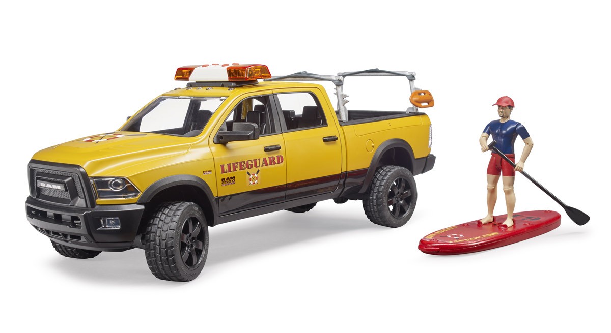 Bruder Toys 02506 RAM 2500 Power Wagon Life Guard with figure - Stand Up Paddle and Light & Sound Module Scale 1:16