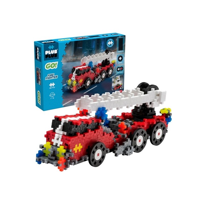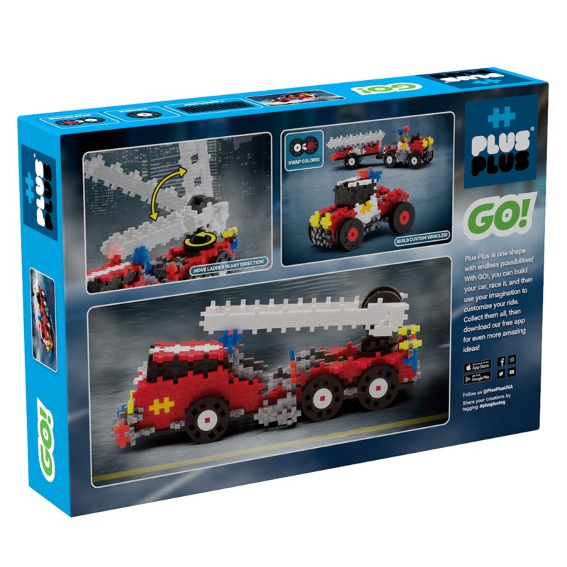 With GO!, you can build a car, race it, and then use your imagination to customize your ride. The GO! Fire Fighter includes 360 pieces in 8 different colors, 9 wheels, and 2 chassis baseplates along with instructions to create a Fire Fighter. Once you assemble, download our free app for even more building ideas. Plus-Plus is made in Denmark in our own zero-plastic-waste factory powered by renewable energy.