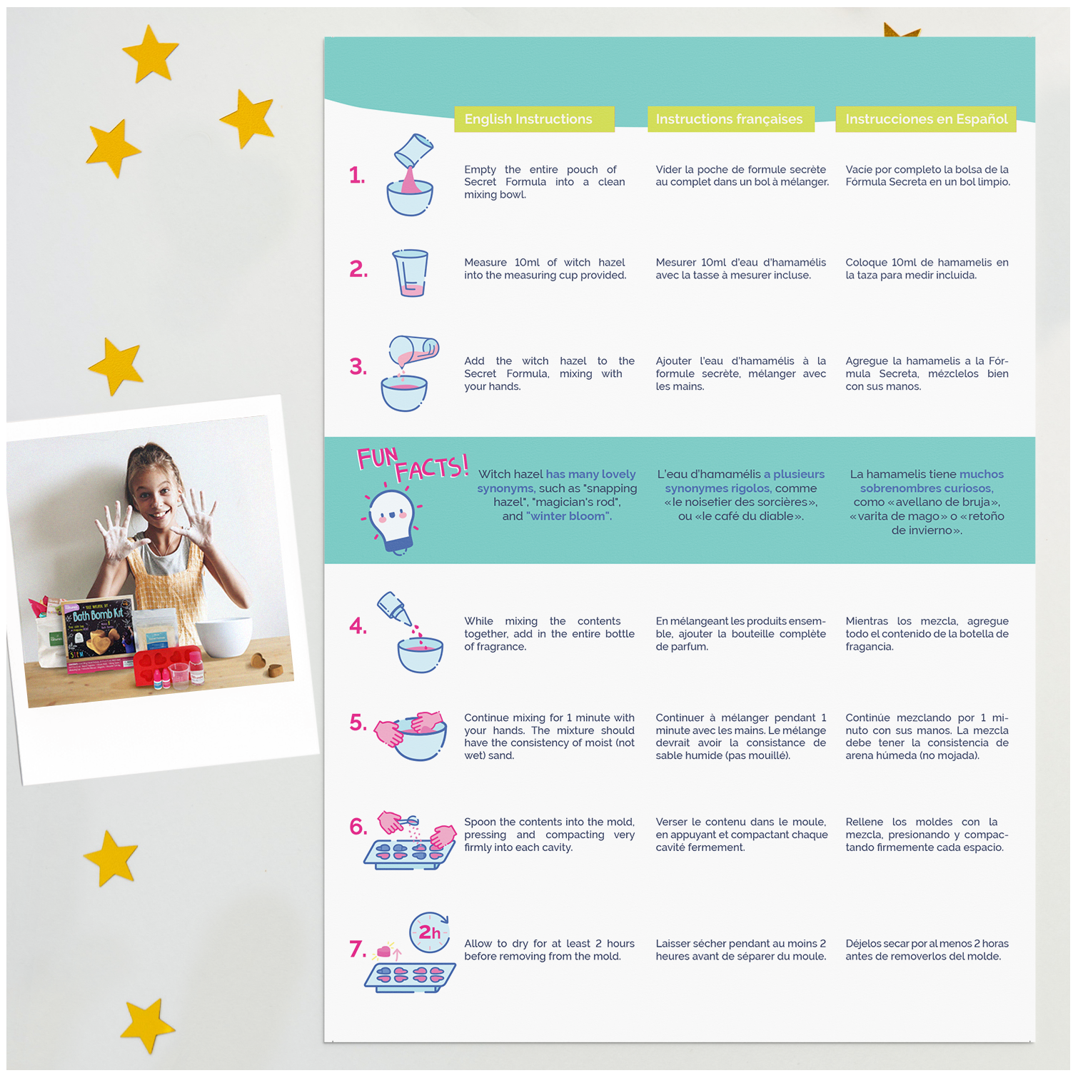 Our award-winning, all-natural, and eco-friendlier DIY Bath Bomb Kit blends science and fun together in the comfort of your kitchen! Combine the Secret Formula and Witch Hazel together with our signature natural fragrances. Press into the reusable heart-shaped silicone mold, allow to dry, then watch as they fizz and bubble in the bath water! Now available in gold mica.