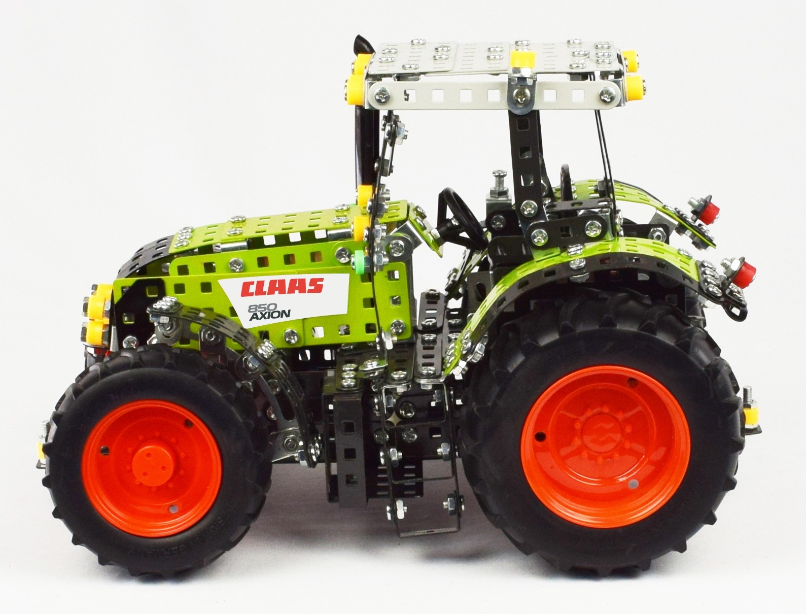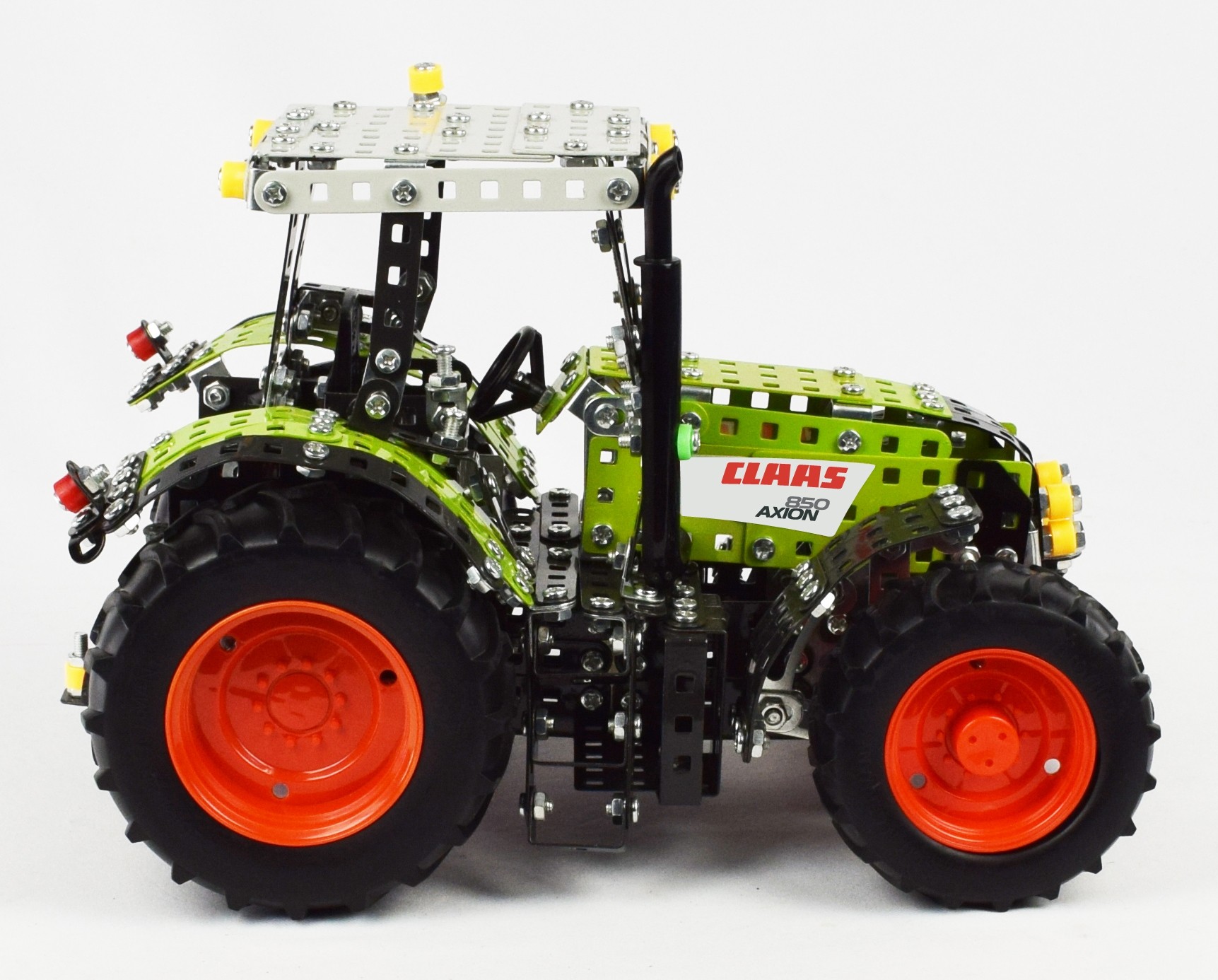 DIY Metal Kit, Tractor CLAAS AXION 850, 1012 parts, scale 1:16, made of metal and high quality plastic material, steering function, free-wheel action, tyres with original patterns made of soft plastic, including trailer tow hitch, weight of tractor is 1,78 kilograms(!), build in full details, all parts will only be fixed with screws and locked with nuts, made of quality metal, including CLAAS-decals, equipped with tools for assembling, instruction manual with pictures for easy assembling, recommended for age 12+, packed in a gift box.