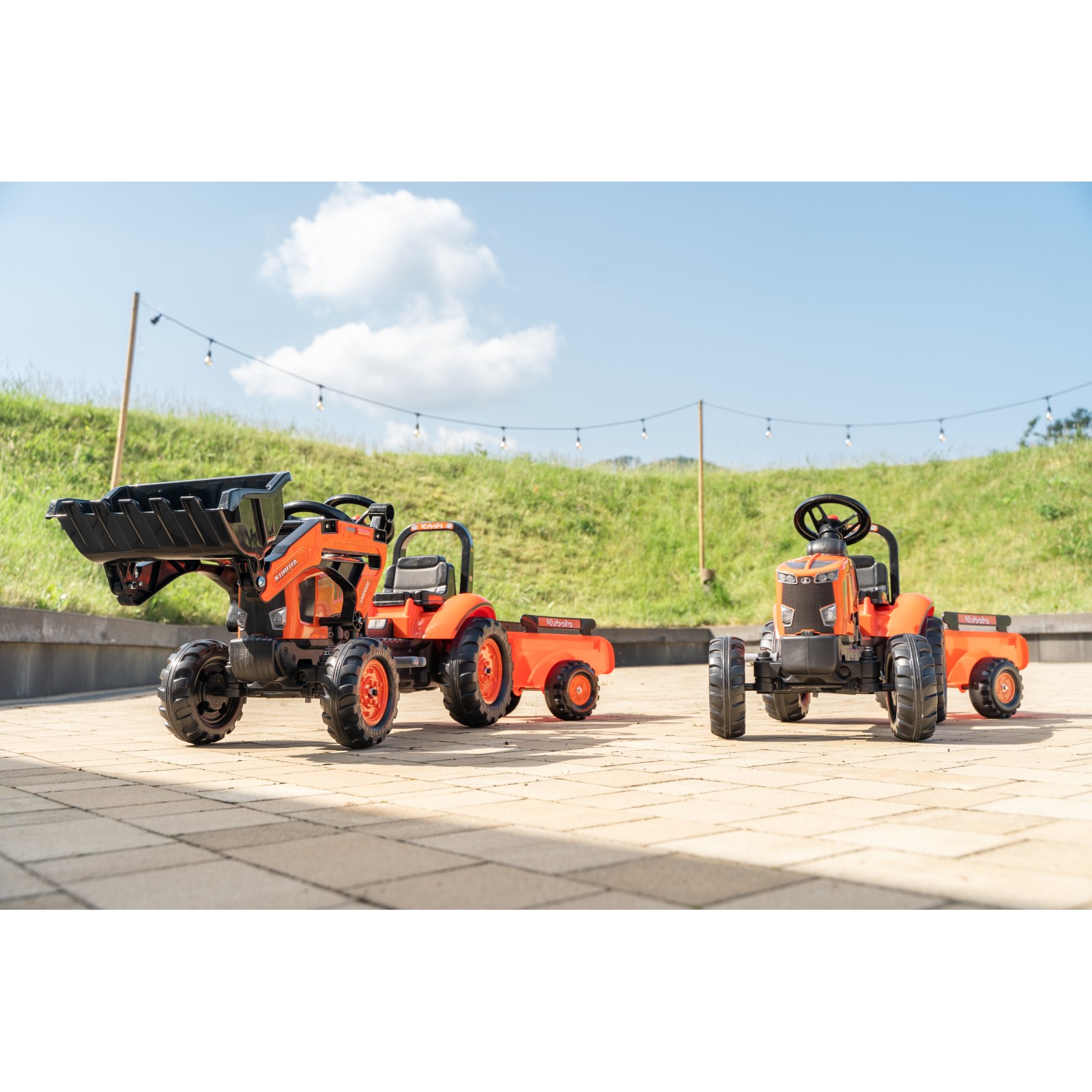 Bring farm-style adventure to your backyard with this officially licensed Kubota M7171 pedal tractor ride-on toy with a trailer and front loader designed for kids 2-5 years old for encouraging active play while building strength and coordination. Powered by a smooth pedal system, kids can drive their own tractor while building coordination and confidence. The detachable trailer with side panels adds a whole new level of play, perfect for carrying toys, sand, or treasures during outdoor adventures. Equipped with a functional front loader that lets kids scoop, lift, and dump with ease, it adds excitement and turns every ride into a true adventure. Crafted with durable materials and designed for stability, this ride-on toy is made to handle everyday play, whether on grass, pavement, or driveways. This tractor encourages kids to stay active while boosting coordination and creativity. Perfect for kids who love farm toys, this tractor turns playtime into a fun and engaging experience.