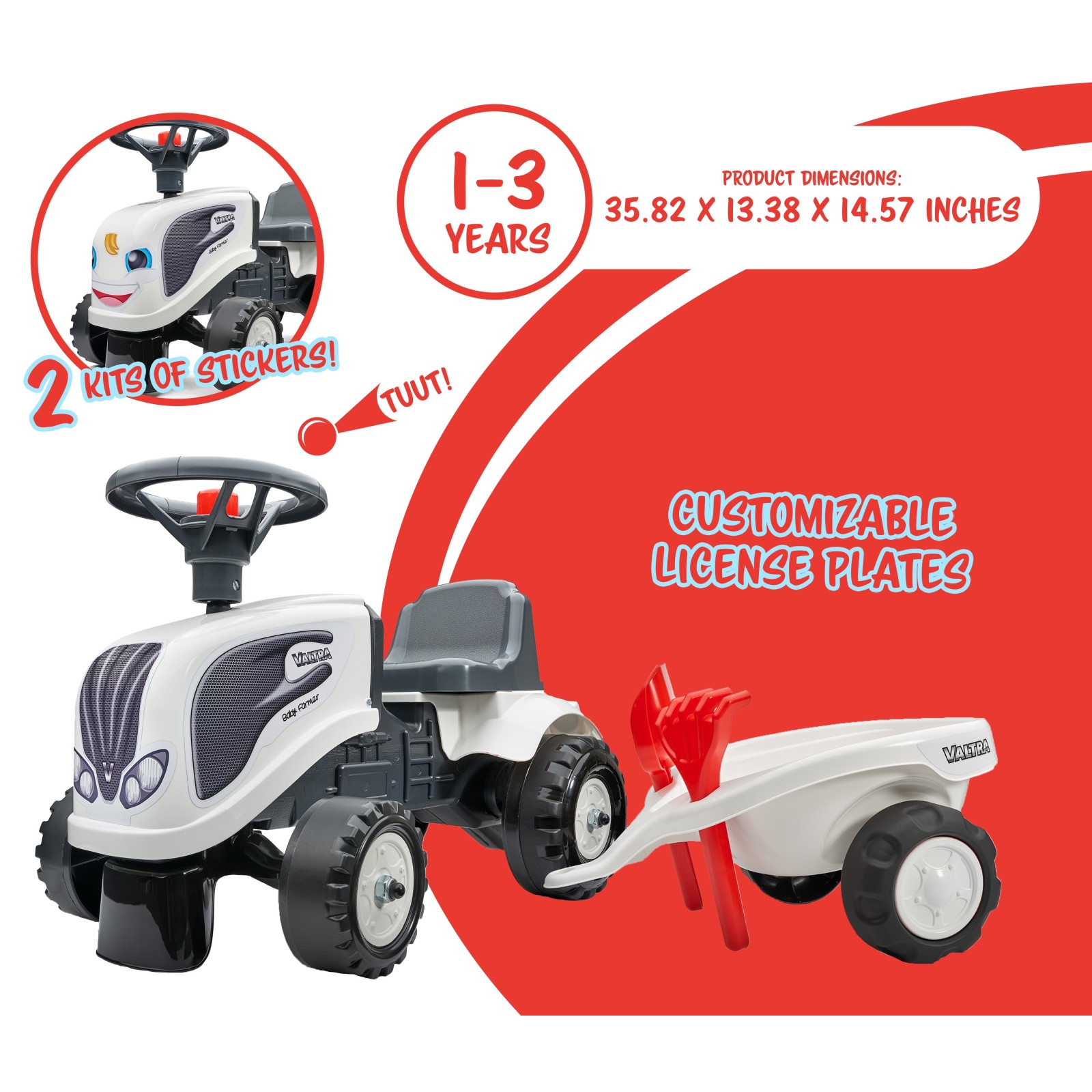 Get ready to watch your little gardener scurry around on this push-along tractor! Including two sticker packs, you can custom their ride to fit their personalities! The customizable license plate allows for even more fun by adding their name to their new tractor. Watch as they push along and learn valuable motor and balance skills all while having the time of their lives! Use their imagination to create a fun new world, all while being active and getting the valuable exercise they need to be strong and healthy. The steering wheel allows them to easily turn and maneuver obstacles and is equipped with a horn so you'll always know when their coming! The trailer allows them to transport toys or materials from place to place. Complete with a toy shovel and rake, your little gardener can help you outdoors in your yard or garden. This tractor is perfect for indoor or outdoor use, and the lightweight material is perfect for traveling! Made 100% in France, this tractor is ideal for children ages 1 to 3 years old.