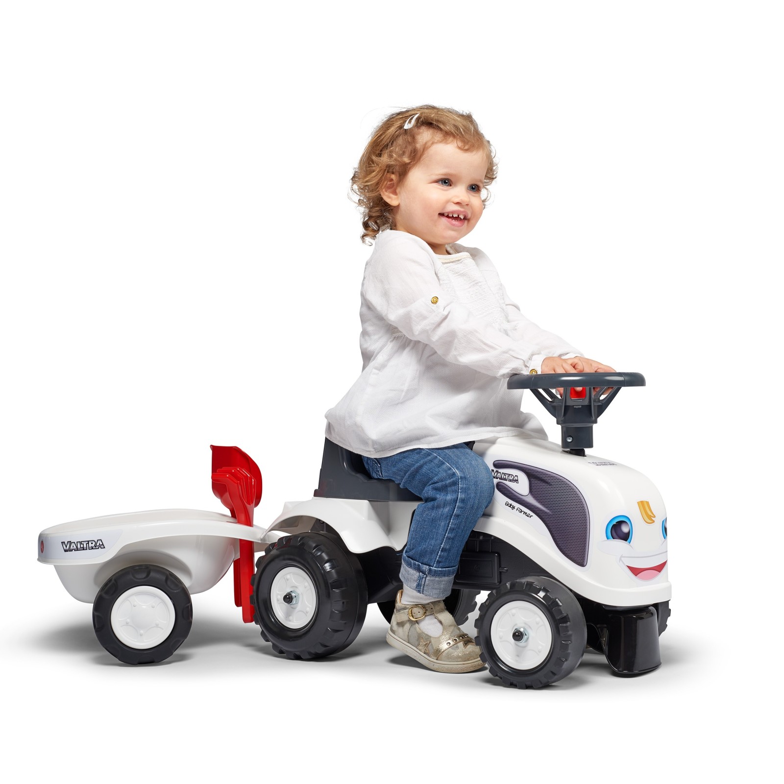 As a farmer or gardener, this push ride-on Valtra tractor will keep toddlers active and engaged while they're having fun. With its removable trailer, toddlers can load and carry toys during their drive, just like a real vehicle! Moreover, the included shovel and rake set inspire creative play in the sand and develop eye-hand coordination. Thanks to the directional steering wheel with horn, which offers your little one a sense of freedom with excellent stability. An extra adhesive kit is included, allowing your toddler to choose the style and customize the license plate. Whether exploring the great outdoors or cruising indoors, this tractor will provide endless entertainment