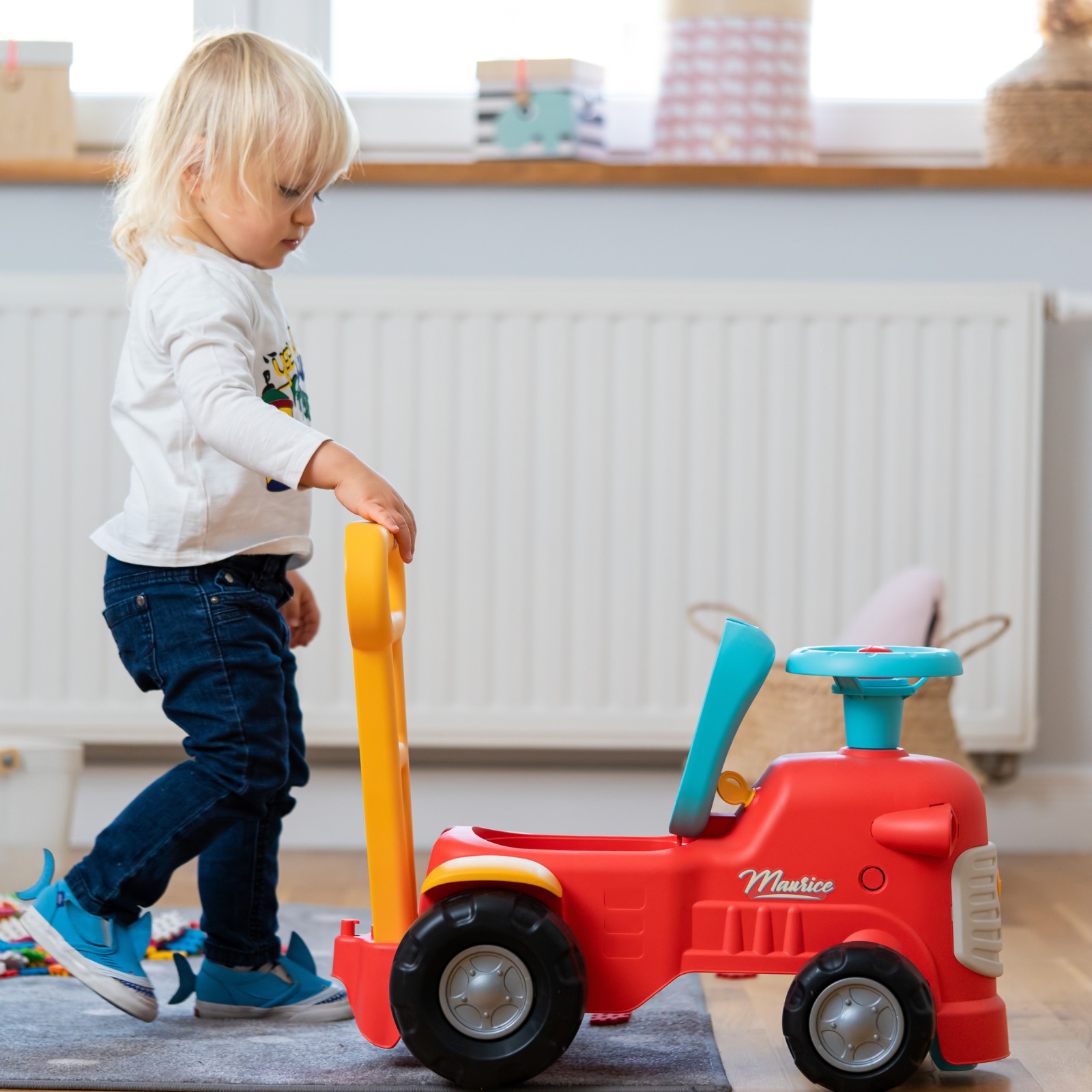 Let your little one explore the world with this 2-in-1 Toddler Push Walker Ride-On Tractor! Designed to support early walking skills and promote active play, this multifunctional toy transforms from a sturdy push walker into an exciting ride-on vehicle. The interactive squeak horn and key sound add a layer of sensory fun, giving toddlers a realistic "tractor" experience as they honk and roll through indoor or outdoor adventures. Under the seat, a hidden storage compartment gives your toddler a special place to stash their favorite stuffed animal. With its detachable trailer, toddlers can haul their toys or pretend farmer tools. Whether they’re taking their first steps or zooming around in full farmer mode, this walker push ride-on encourages balance, coordination, and imaginative play. Thanks to the directional steering wheel, which offers your little one a sense of freedom with excellent stability. The tractor's thoughtful design includes charming details like friendly "eyes" on the front, making it a perfect companion for your toddler's early adventures.
