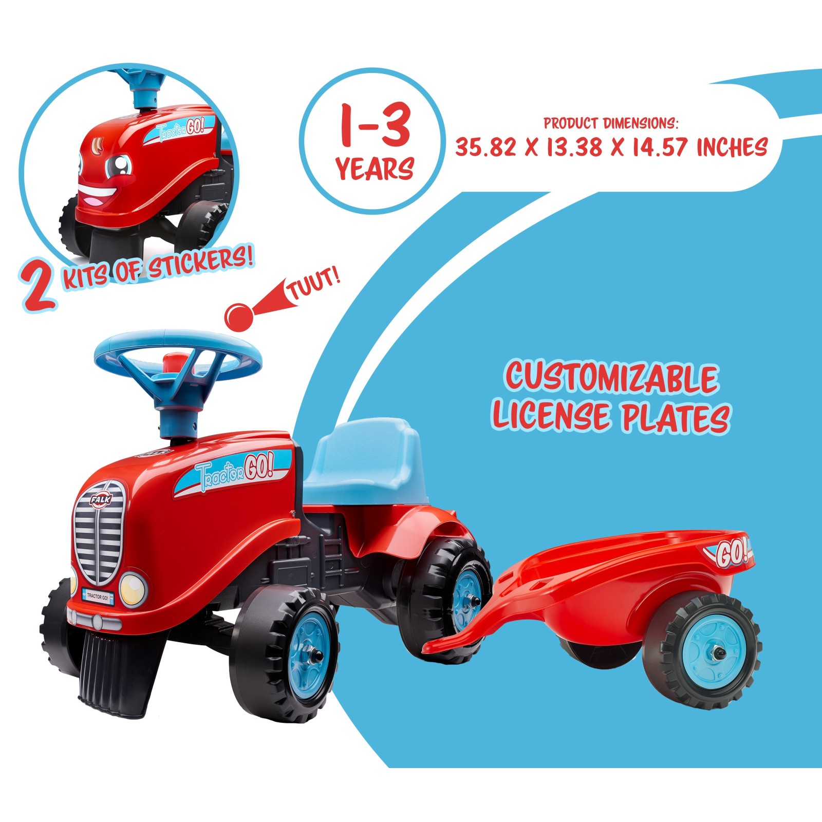 Falk reinvents its ride-on tractor, 100% made in France for toddlers from 1 year old. Even more fun with its rounded contours and mischievous smile, it will delight little gardeners. Its bright colours are ideal to stimulate baby, who will also be able to develop his or her motoring skills and balance while having fun! As much at home in the garden as indoors thanks to its steering wheel and horn, this charming little tractor and trailer will be your toddler's favourite way to transport their cuddly toys from the bedroom to the lounge or outdoors. And for those who prefer a tractor with a vintage look, an extra sticker kit is included that enables toddlers to personalise their favourite toys as they please!