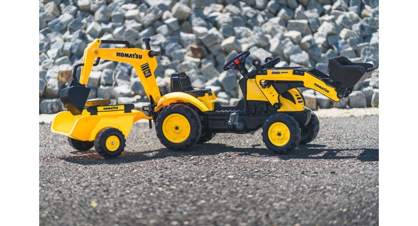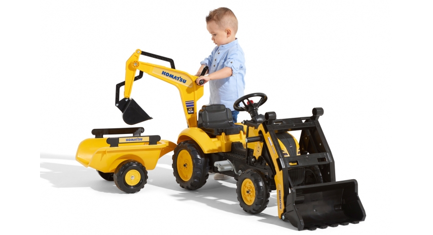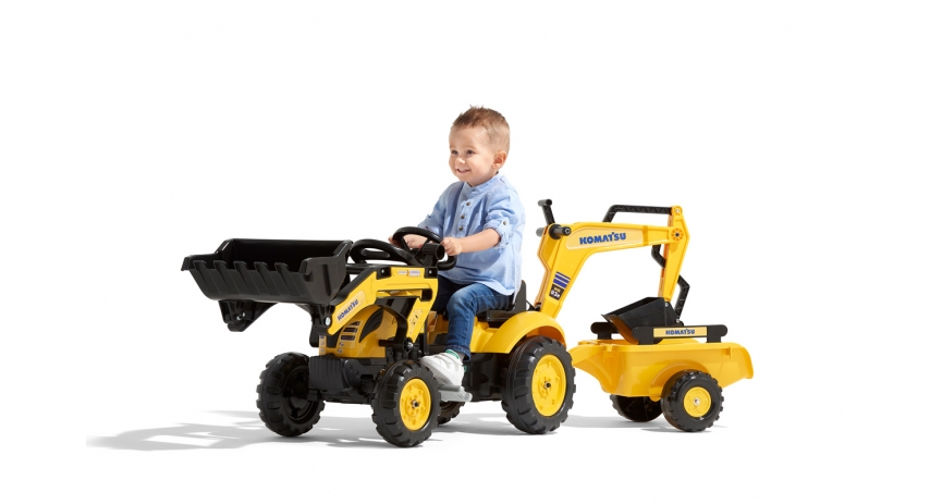 Equipped with a working front loader, a rear excavator, and a detachable trailer with side panels, it offers endless outdoor adventure and pretend play. The pedal-powered design helps build coordination and motor skills, while the safe, durable construction stands up to tough play in the backyard, or driveway. Perfect for children who love trucks, tractors, and heavy equipment, this Komatsu ride-on turns any day into a construction day.