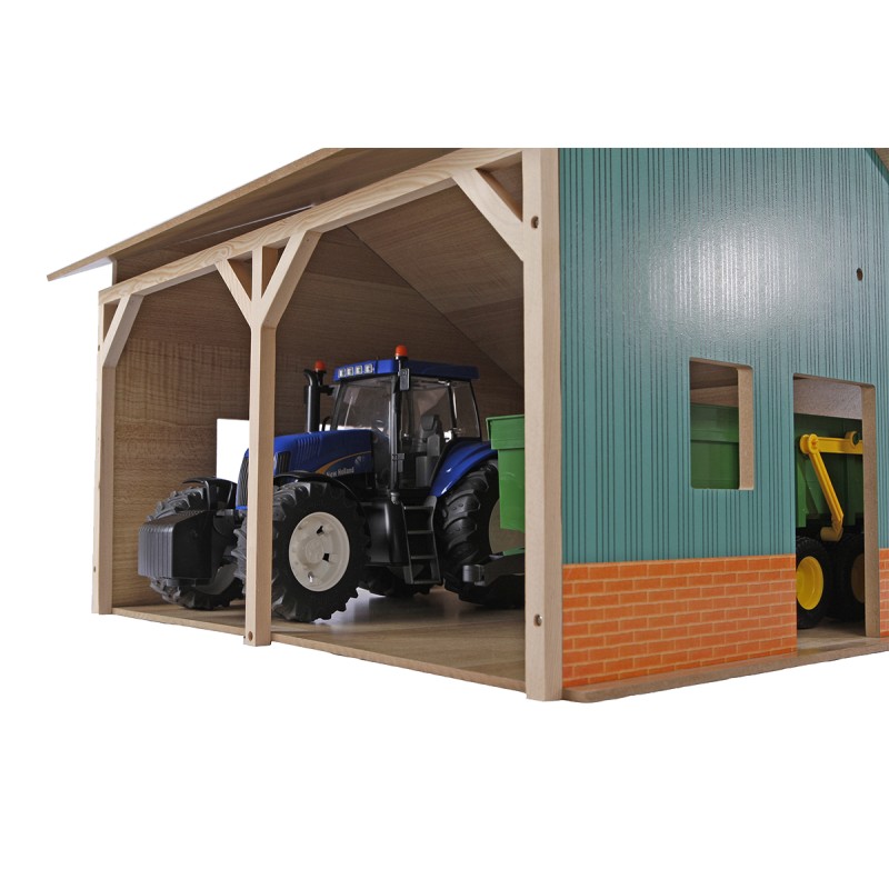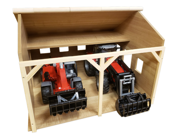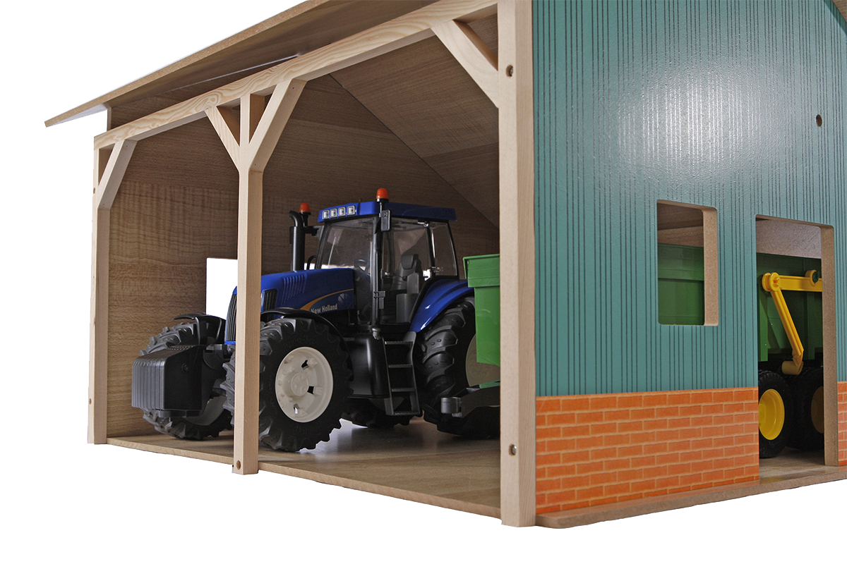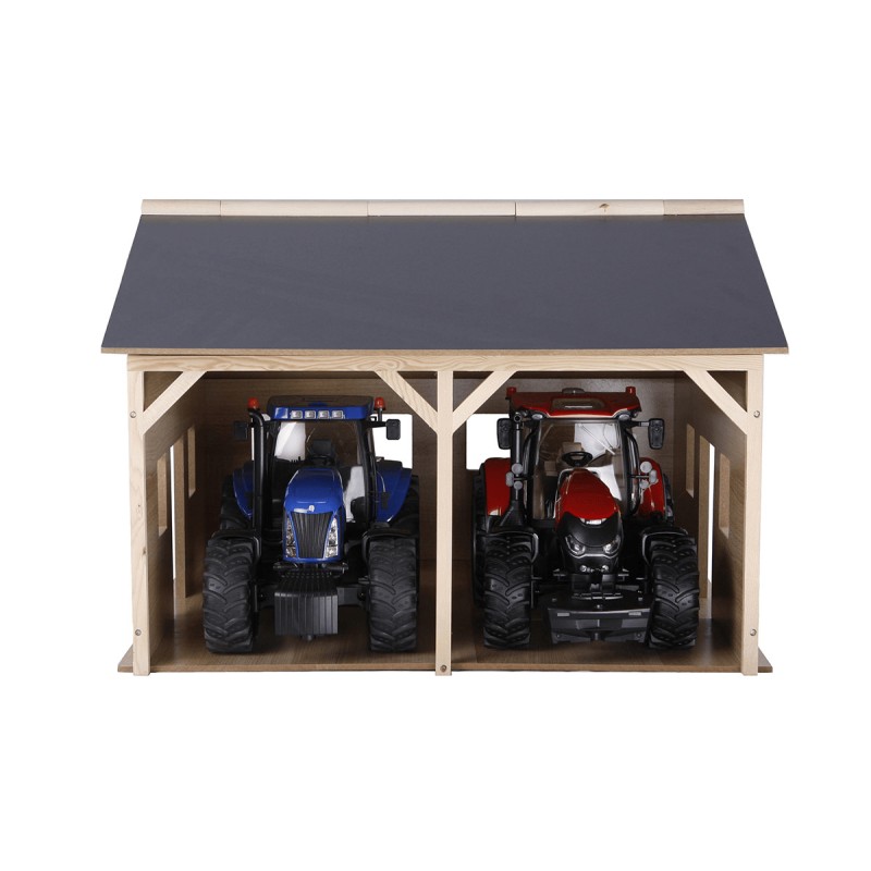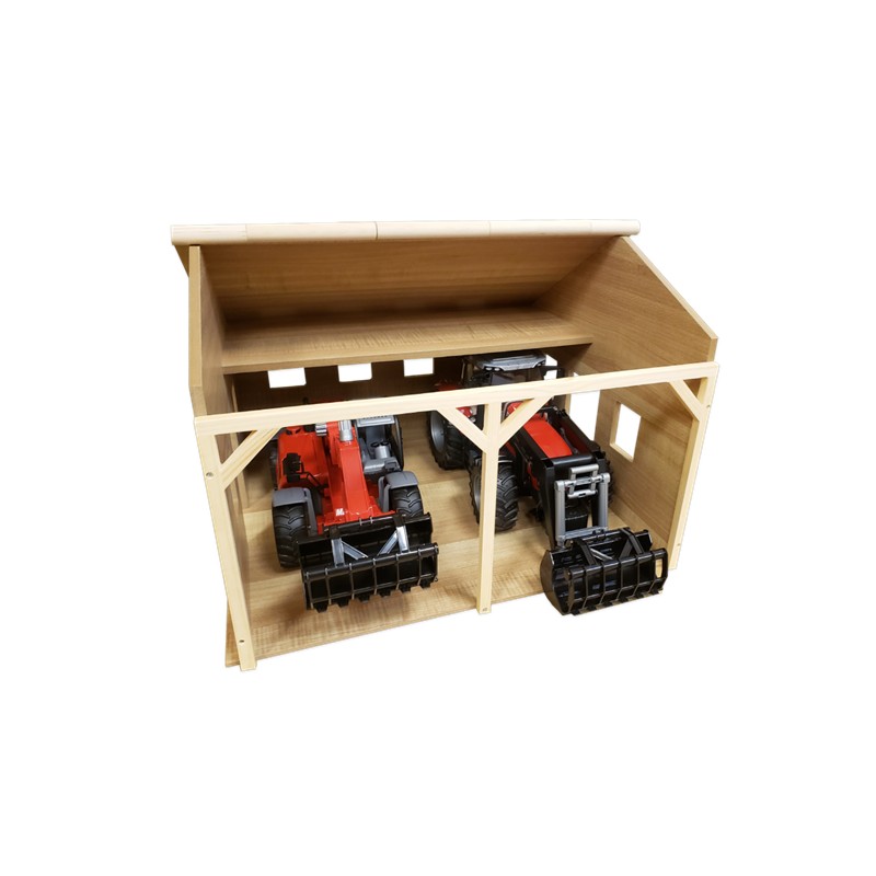 Bring farm life to your playroom with this 1:16 scale wooden farm shed toy, designed to fit up to 2 tractors or trucks and accessories. Made from durable wood with realistic details like open bays for easy access and a spacious hayloft. The half-folding roof makes it easy to play from the top. Perfect for storing toy tractors, trucks, trailers, and farm equipment, this shed encourages imaginative play and helps children develop coordination and storytelling skills. Compatible with popular 1:16 scale farm toys such as Bruder and Big Farms, this wooden shed makes a great addition to any young farmer’s collection or collector.