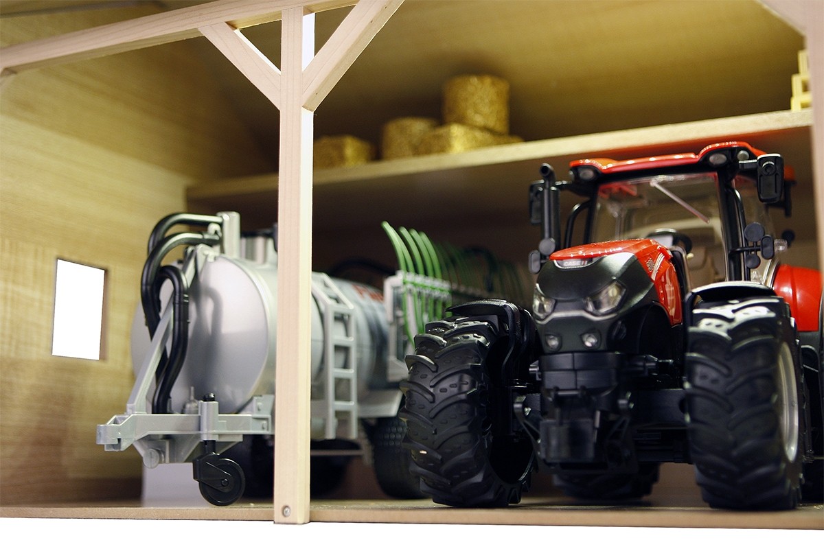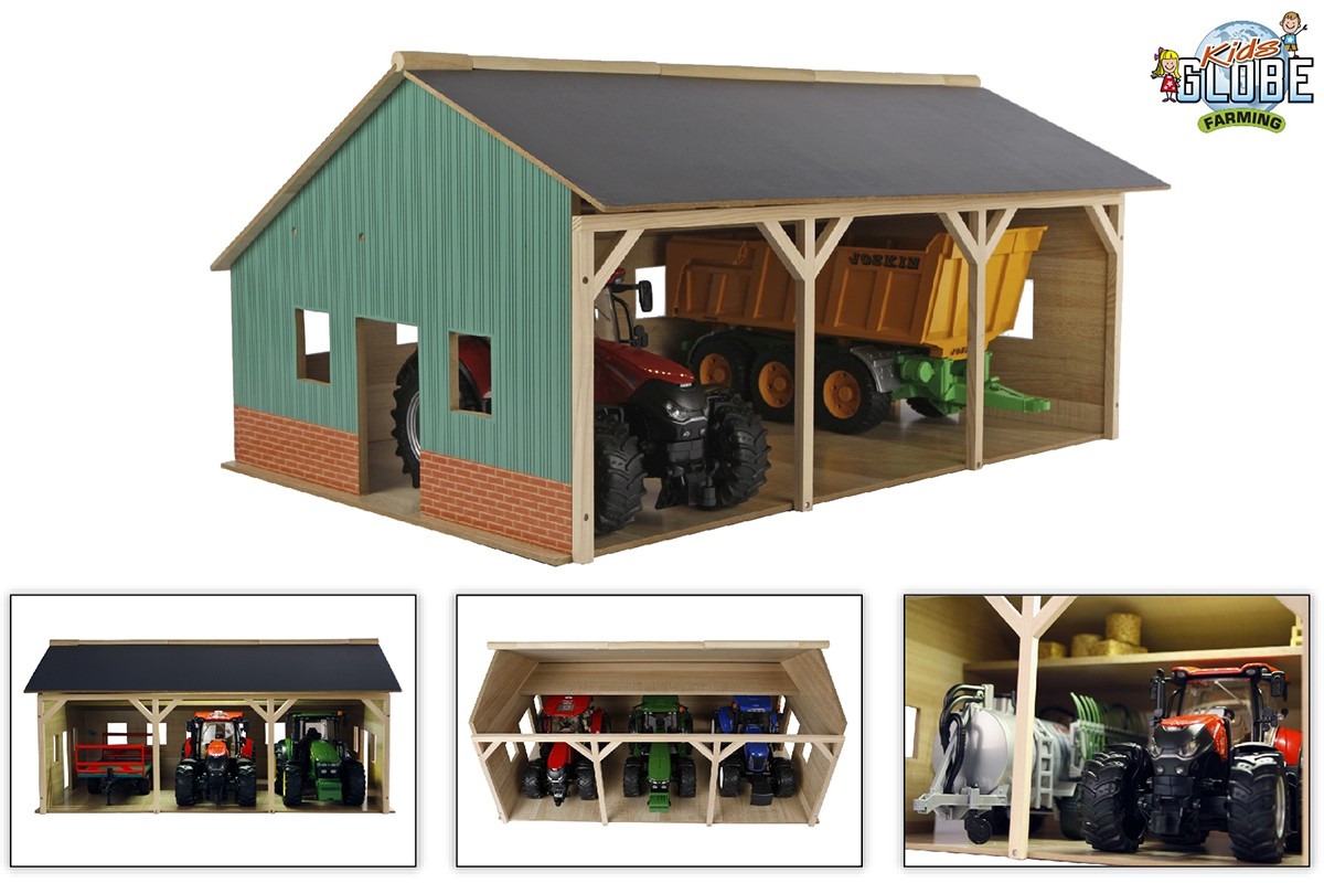 Bring farm life to your playroom with this 1:16 scale wooden farm shed toy, designed to fit up to 3 tractors or trucks and accessories. Made from durable wood with realistic details like open bays for easy access and a spacious hayloft. The half-folding roof makes it easy to play from the top. Perfect for storing toy tractors, trucks, trailers, and farm equipment, this shed encourages imaginative play and helps children develop coordination and storytelling skills. Compatible with popular 1:16 scale farm toys such as Bruder and Big Farm, this wooden shed makes a great addition to any young farmer’s collection or collector.